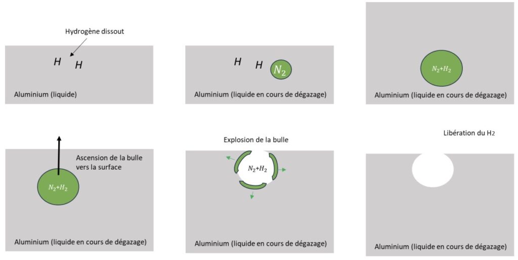 Le processus est simple, les bulles d’azote n’ont pas d’affinité avec l’aluminium, elles vont donc servir « d’ascenseur vers la surface » en se combinant avec le H2. Les bulles remontent ensuite à la surface et l’hydrogène est évacué. C’est le processus de dégazage.