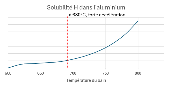 La dissolution de l’hydrogène est fonction de la température du bain. A partir de 680°C, la solubilité croit énormément. Au-delà de ce seuil, la teneur en H double pour 110°C1 d’augmentation.