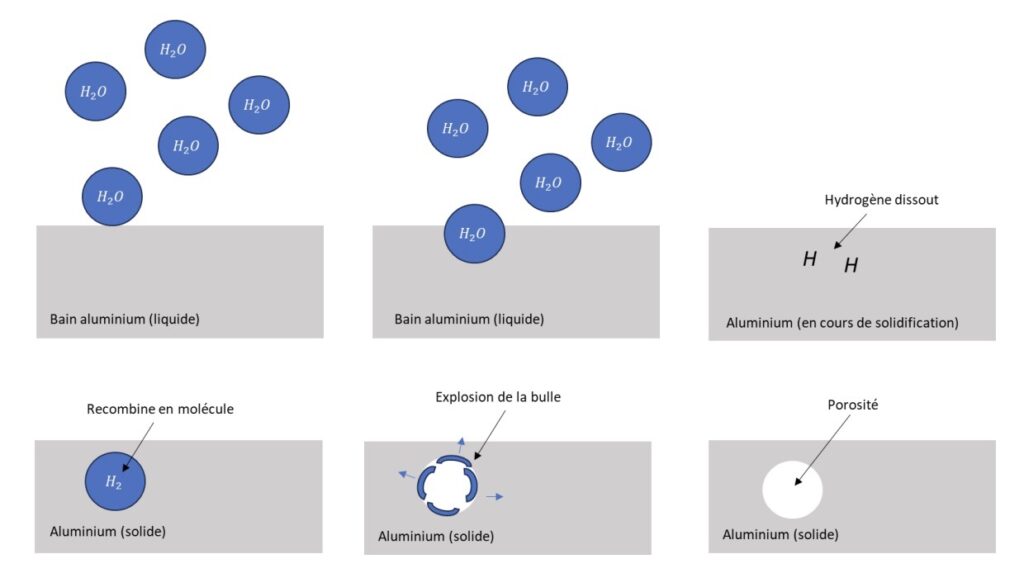 En effet, l’eau présent dans l’humidité de l’air ambient ayant une très grande affinité avec l’aluminium, interagissent ensemble pour produire de l’oxyde d’aluminium et de l’hydrogène. Tant que l’aluminium reste liquide, l’hydrogène reste dissous sous forme atomique (H). Cependant, lors du refroidissement et de la solidification la solubilité de l’hydrogène chute. Ainsi, les atomes d’hydrogène se regroupent pour former du H2 gazeux (bulle). Lorsqu’elles explosent, elles créent une porosité.
